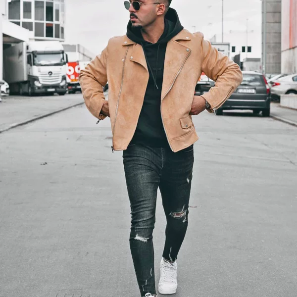 Suede jackets are known for their lightweight feel, smooth texture, and luxuriousness, often made of goatskin or sheepskin leather. It’s a versatile outerwear piece that adds a touch of elegance to any outfit. You can wear it with various clothes, including button-down collared shirts, polos, chinos, jeans, and more, to add layers and personality to your look.