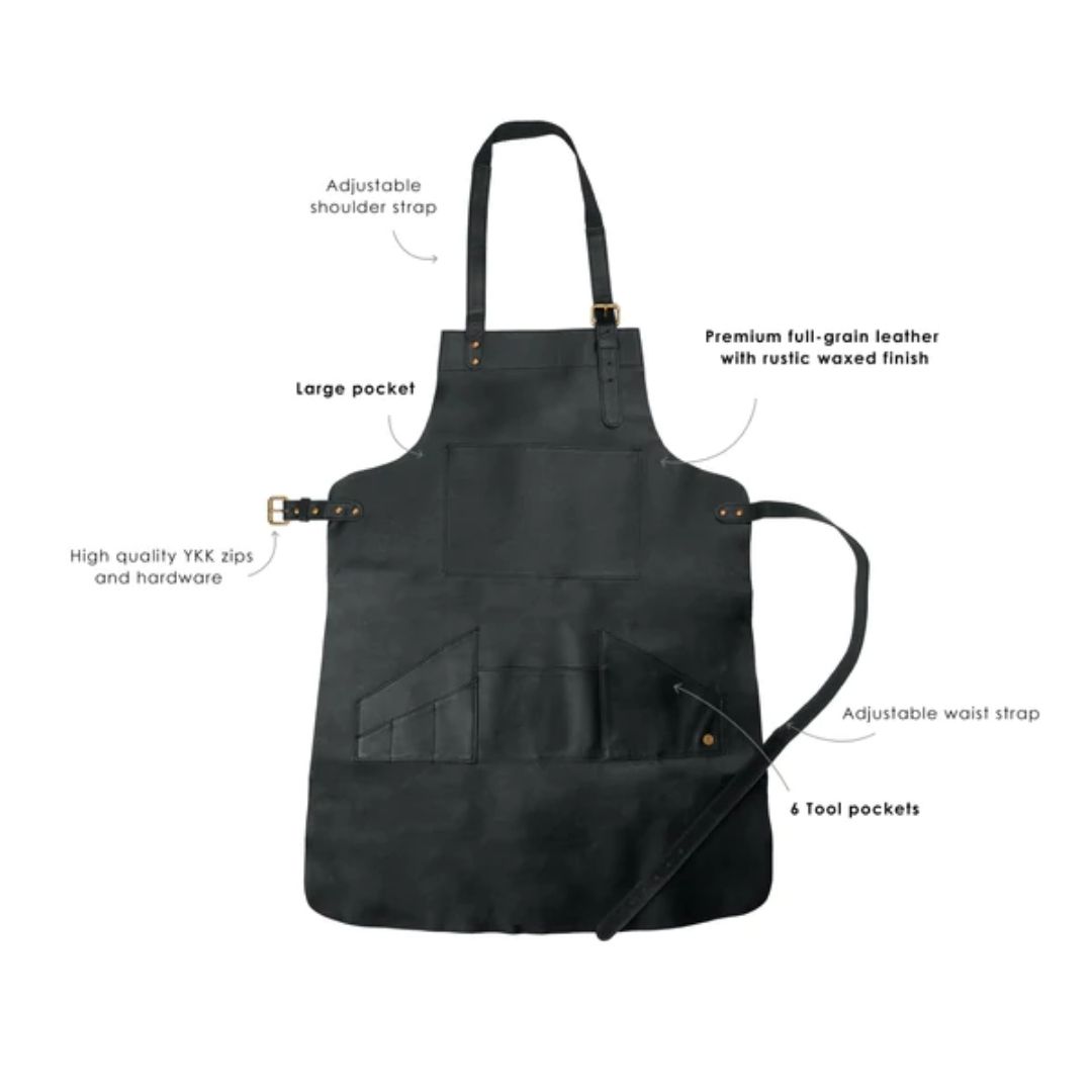 Introducing our brand new full-grain leather multi-pocket apron in a distressed ebony black finish. A practical leather apron for hobbyists including ceramics, woodwork, painting, and metalwork, this durable apron is also a great option for food enthusiasts including butchers, chefs, and barbecue enthusiasts!